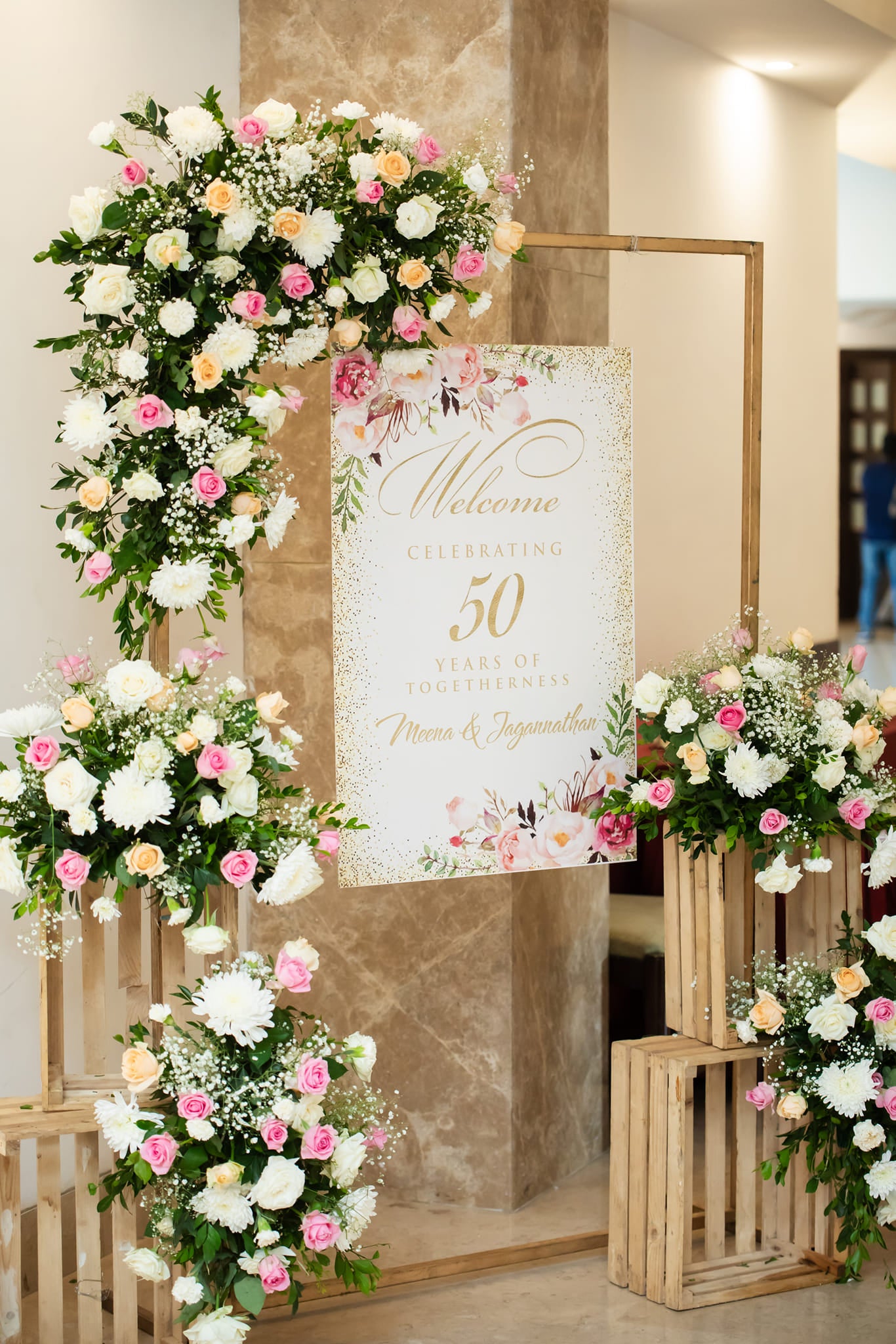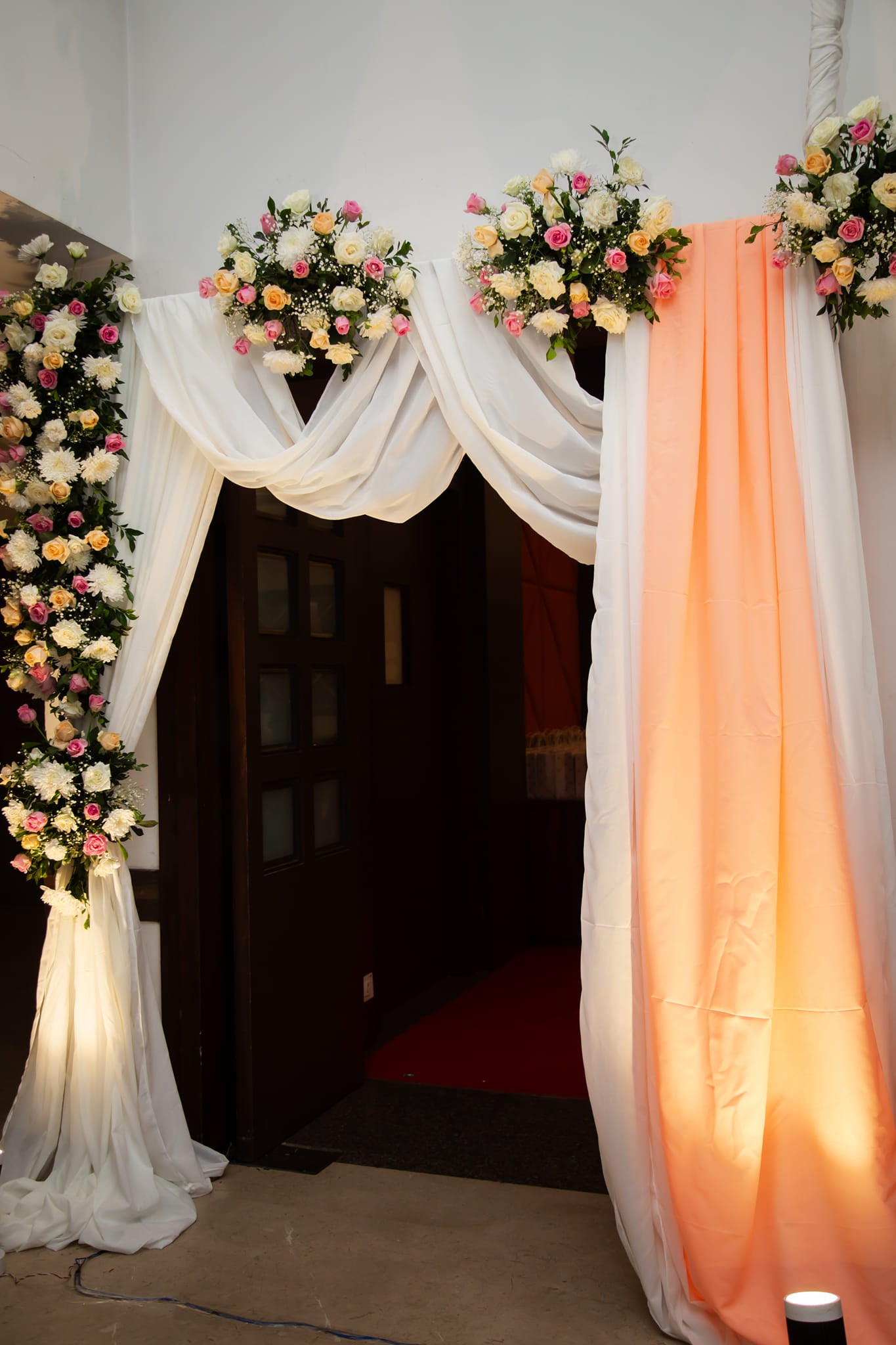 Add a touch of elegance and romance to your anniversary celebration with our Floral Drape Anniversary Decor. Adorn your entrance with flowy curtains and flower stands, creating a beautiful and inviting atmosphere for your guests. Celebrate your love in style with this stunning decoration.